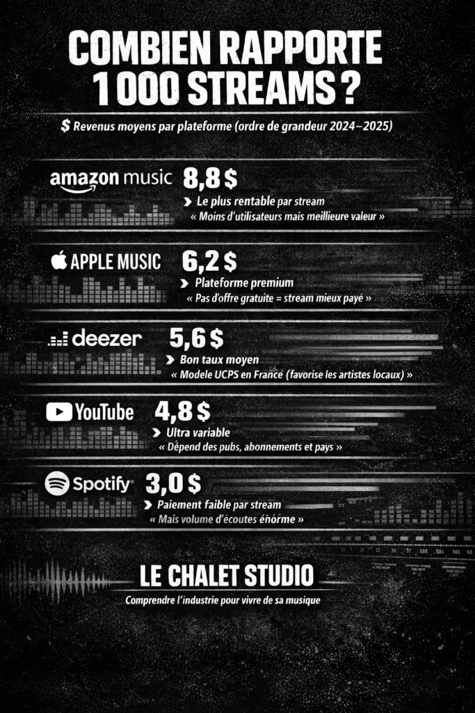 - Spotify : ~3,0 $ × 1 000 = ~3 000 $ pour 1 000 000 de streams (moyenne indicative).